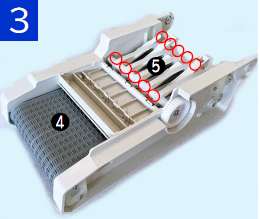※グレー色のベルト部④は手で回しながら食器洗い用スポンジを使い、全体を1周しっかりとこすり洗いしてください。 5本のローラーゴム部⑤は、横にずらしながらゴムの裏面と○回転軸部分を、中性洗剤で泡立てながら指で丁寧に洗浄してください。 (水洗い後、ローラーゴムは元の位置に戻してください。)