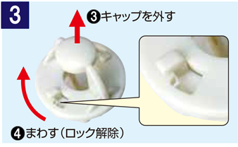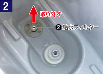 給水フィルターのキャップ③を取り外し、内部のメッシュをブラシ等で掃除してください。 給水フィルターのキャップ③を取付け、給水フィルター②を取り付けます。